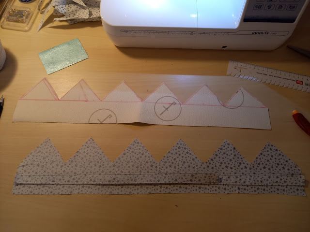 Sur l'envers de votre tissu principal dessiner la couronne. Pour ce faire, tracer un rectangle de 54cm x 11cm. Dans ce rectangle, tracer une ligne à 5cm de haut et dessiner vos créneaux en triangle.